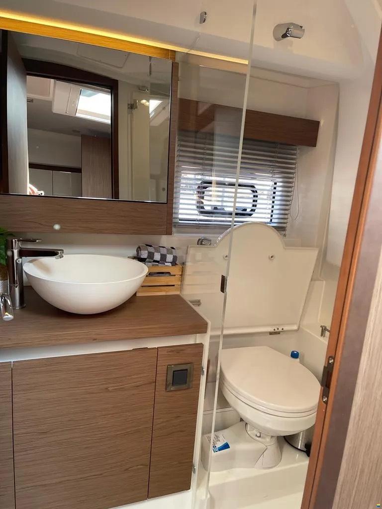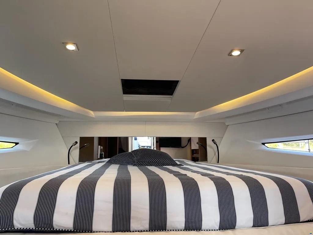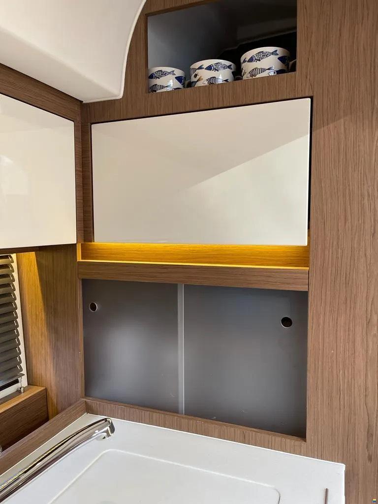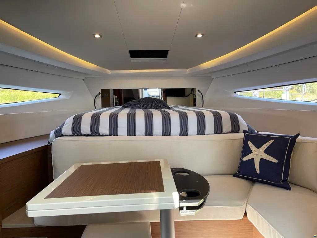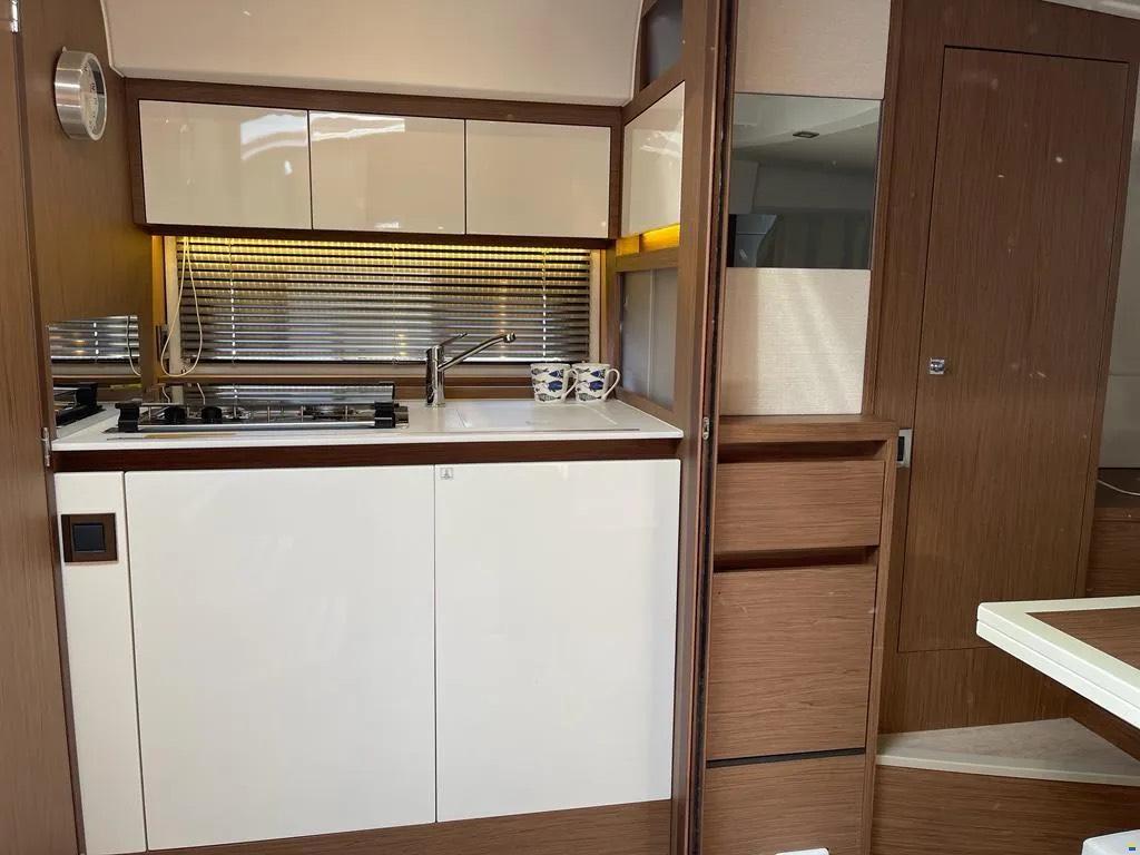Die Jeanneau Leader 36 kombiniert sportliche Performance mit hohem Komfort. Dank Joystick und Bugstrahlruder ist sie auch in engen Häfen leicht zu manövrieren. Das Cockpit lädt zu geselligen Stunden ein, während unter Deck zwei komfortable Kabinen und ein heller Salon zum Entspannen einladen. Ideal für alle, die Fahrspaß, Stil und Komfort schätzen.