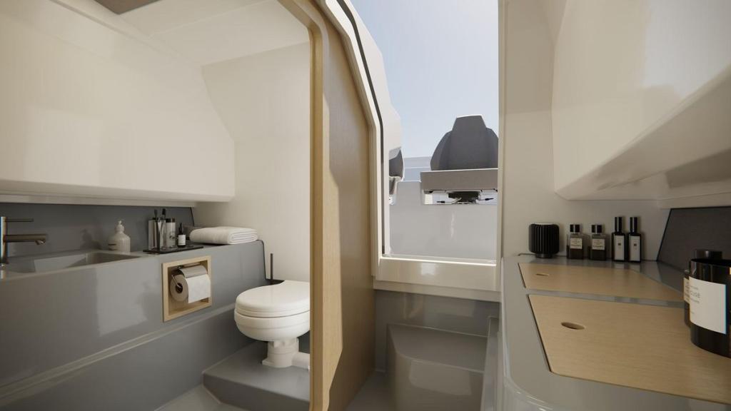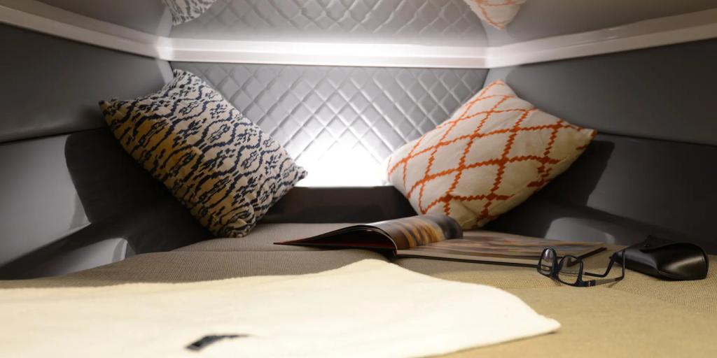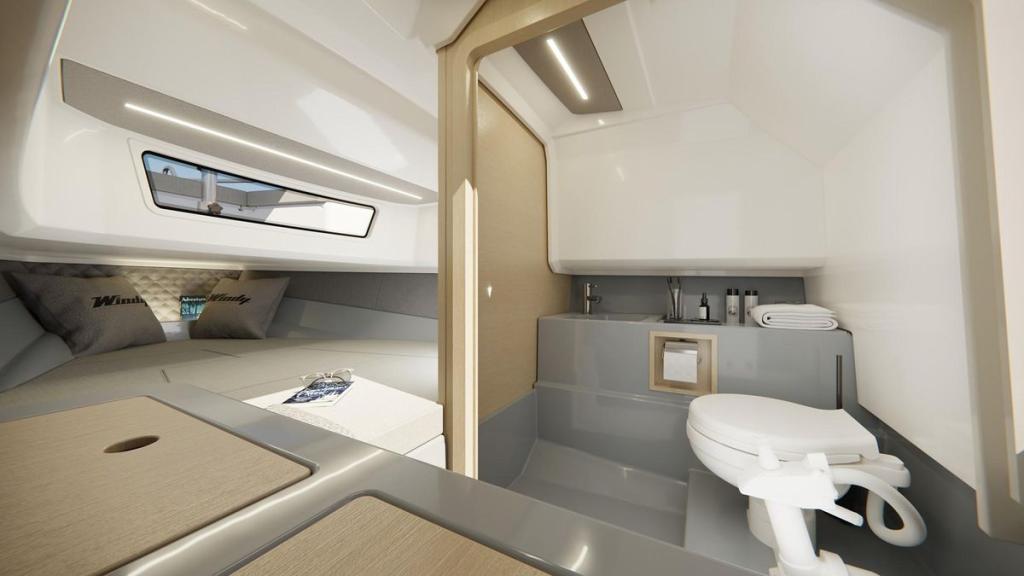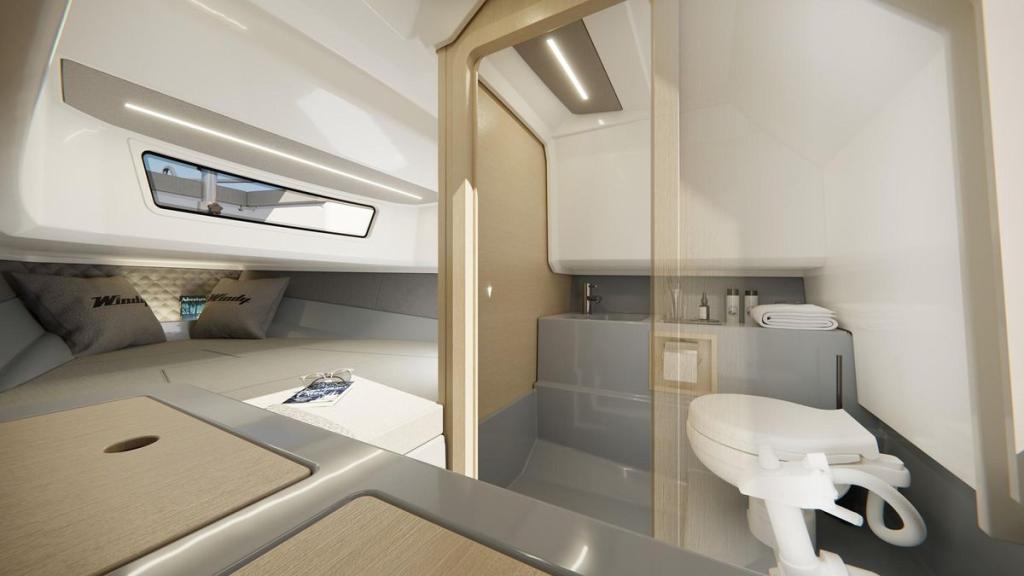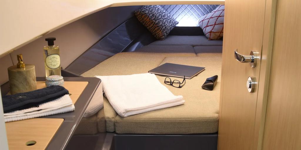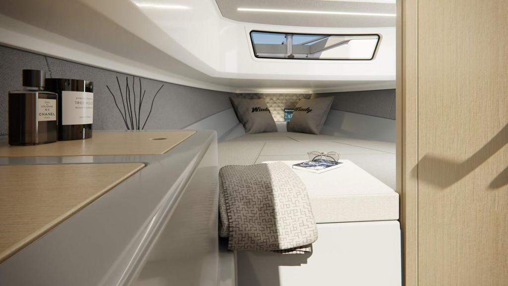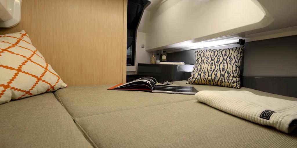 Unter Deck überrascht die SR28 CC mit einer hellen, eleganten Kabine mit Doppelkoje und separatem WC, ideal für Wochenendausflüge oder als Rückzugsort nach einem Tag in der Sonne.