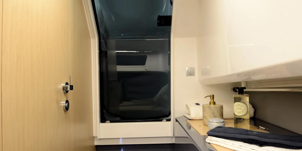 Kabine: Hochwertig verarbeitet mit Schlafplatz für zwei Personen und WC